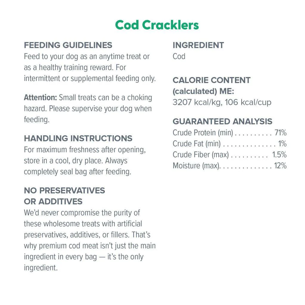 Satisfy your dog’s cravings with the irresistible crunch of Cod Cracklers™ — made from 100% wild-caught cod and nothing else. These single-ingredient treats are gently air-dried to lock in savory flavor and essential nutrients, creating a crisp texture that even picky pups can’t resist.