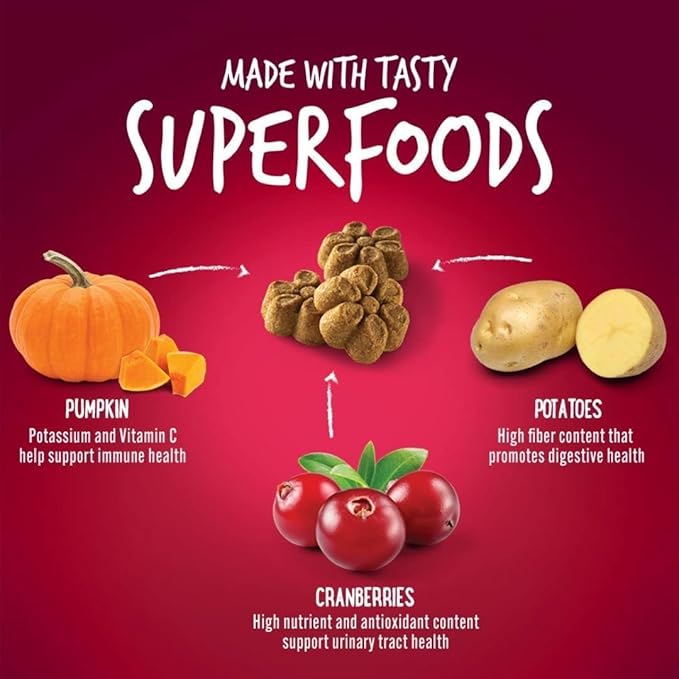 Ingredients: Pumpkin, Oats, Pearled Barley, Potatoes, Sunflower Oil, Cane Molasses, Cinnamon, Cranberries, Natural Apple Flavor, Natural Vanilla Flavor, Mixed Tocopherols (to preserve freshness), Rosemary Extract, Green Tea Extract, Spearmint.