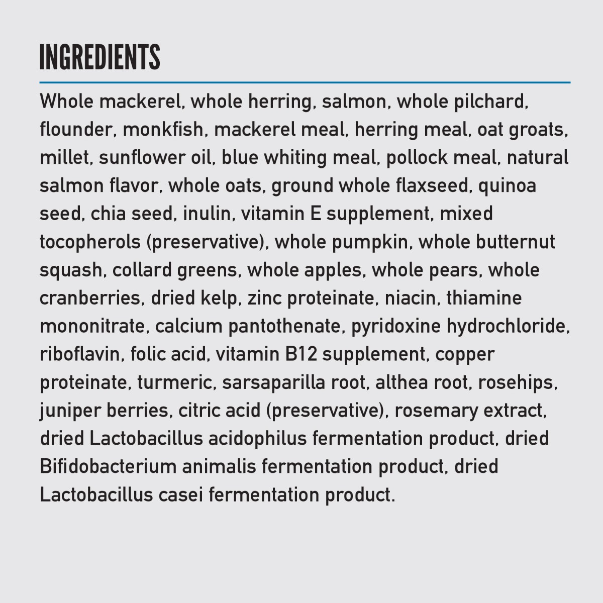 Whole Mackerel, Whole Herring, Salmon, Whole Pilchard, Flounder, Monkfish, Mackerel Meal, Herring Meal, Oat Groats, Millet, Sunflower Oil, Blue Whiting Meal, Pollock Meal, Natural Salmon Flavor, Whole Oats, Ground Whole Flaxseed, Quinoa Seed, Chia Seed, Inulin, Vitamin E Supplement, Mixed Tocopherols (Preservative), Whole Pumpkin, Whole Butternut Squash, Collard Greens, Whole Apples, Whole Pears, Whole Cranberries, Dried Kelp, Zinc Proteinate, Niacin, Thiamine Mononitrate, Calcium Pantothenate, Pyridoxine Hydrochloride, Riboflavin, Folic Acid, Vitamin B12 Supplement, Copper Proteinate, Turmeric, Sarsaparilla Root, Althea Root, Rosehips, Juniper Berries, Citric Acid (Preservative), Rosemary Extract, Dried Lactobacillus Acidophilus Fermentation Product, Dried Bifidobacterium Animalis Fermentation Product, Dried Lactobacillus Casei Fermentation Product.
