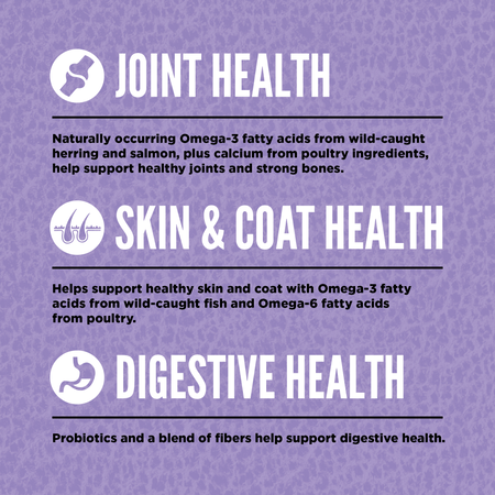 - Naturally occurring omega-3 fatty acids from wild-caught herring and salmon plus calcium from poultry ingredients support joint health.