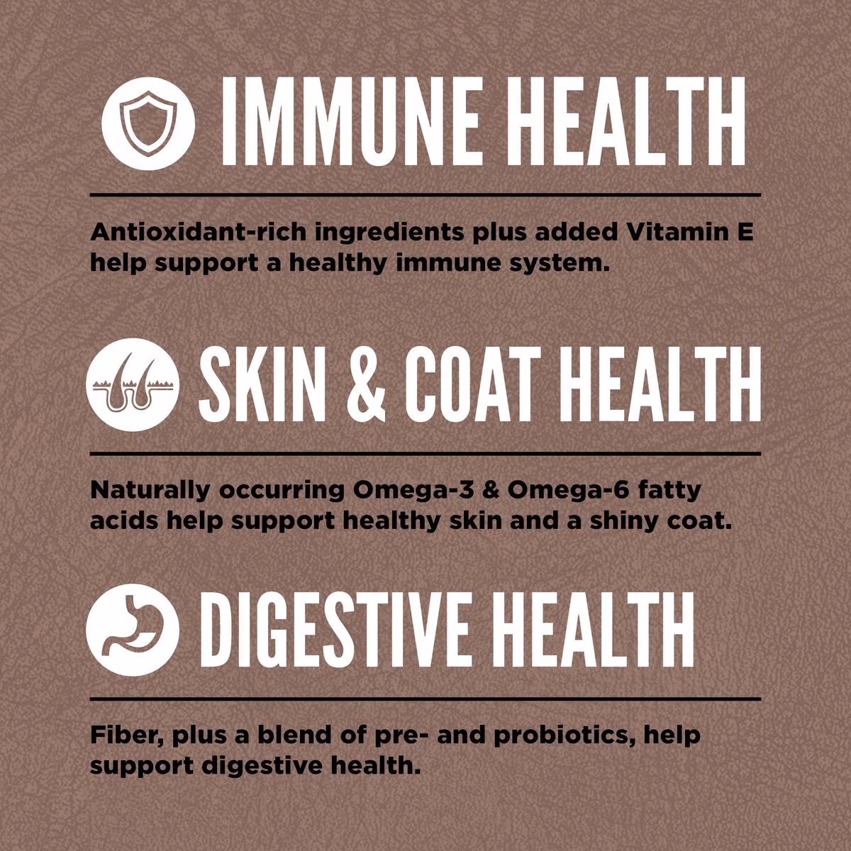 - Made to support immune, skin, coat and digestive health, with no added soy, corn, tapioca or wheat ingredients.