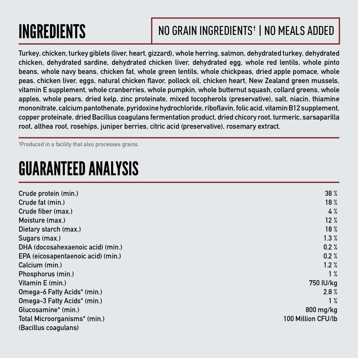 Turkey, Chicken, Turkey Giblets (Liver, Heart, Gizzard), Whole Herring, Salmon, Dehydrated Turkey, Dehydrated Chicken, Dehydrated Sardine, Dehydrated Chicken Liver, Dehydrated Egg, Whole Red Lentils, Whole Pinto Beans, Whole Navy Beans, Chicken Fat, Whole Green Lentils, Whole Chickpeas, Dried Apple Pomace, Whole Peas, Chicken Liver, Eggs, Natural Chicken Flavor, Pollock Oil, Chicken Heart, New Zealand Green Mussels, Vitamin E Supplement, Whole Cranberries, Whole Pumpkin, Whole Butternut Squash, Collard Greens, Whole Apples, Whole Pears, Dried Kelp, Zinc Proteinate, Mixed Tocopherols (Preservative), Salt, Niacin, Thiamine Mononitrate, Calcium Pantothenate, Pyridoxine Hydrochloride, Riboflavin, Folic Acid, Vitamin B12 Supplement, Copper Proteinate, Dried Bacillus Coagulans Fermentation Product, Dried Chicory Root, Turmeric, Sarsaparilla Root, Althea Root, Rosehips, Juniper Berries, Citric Acid (Preservative), Rosemary Extract.