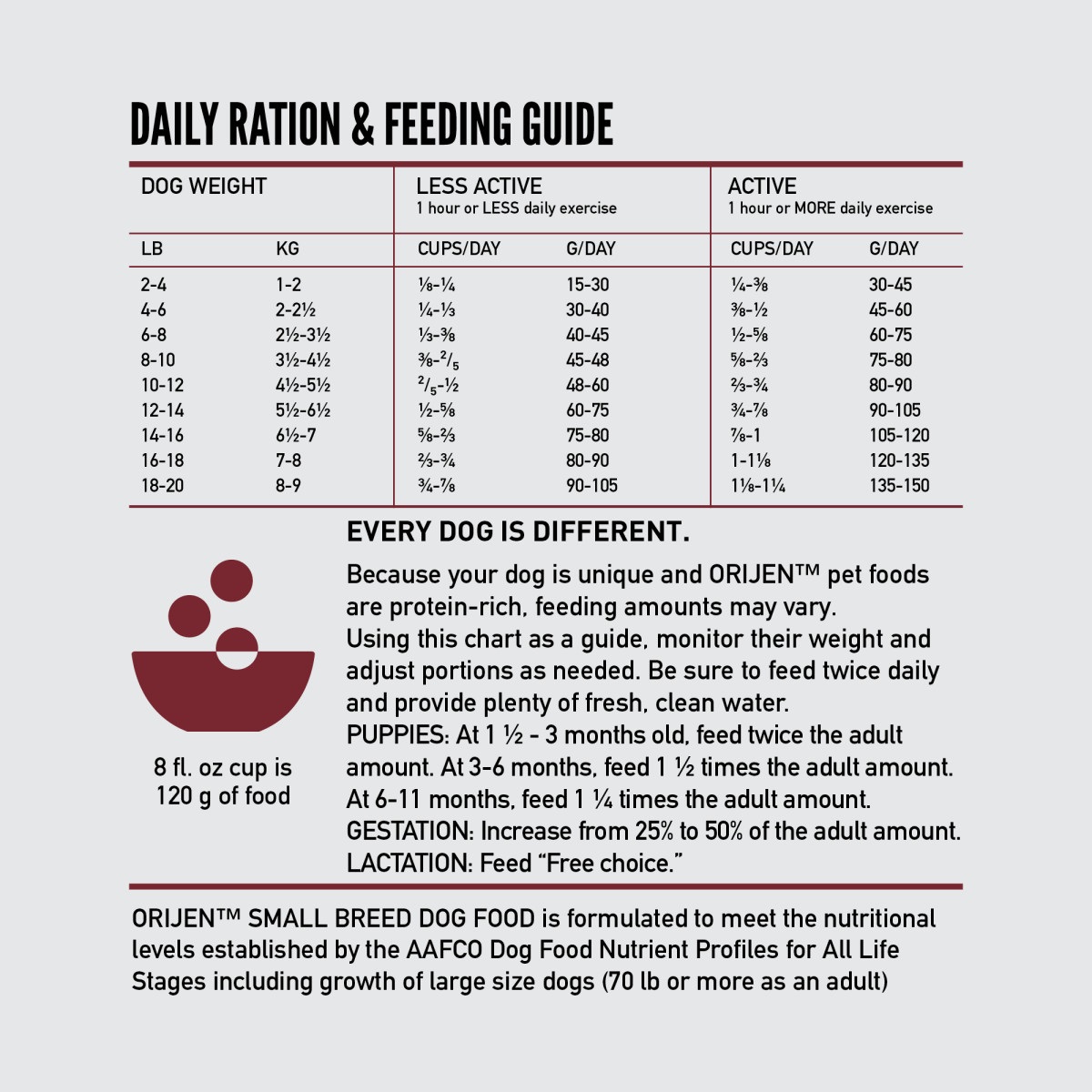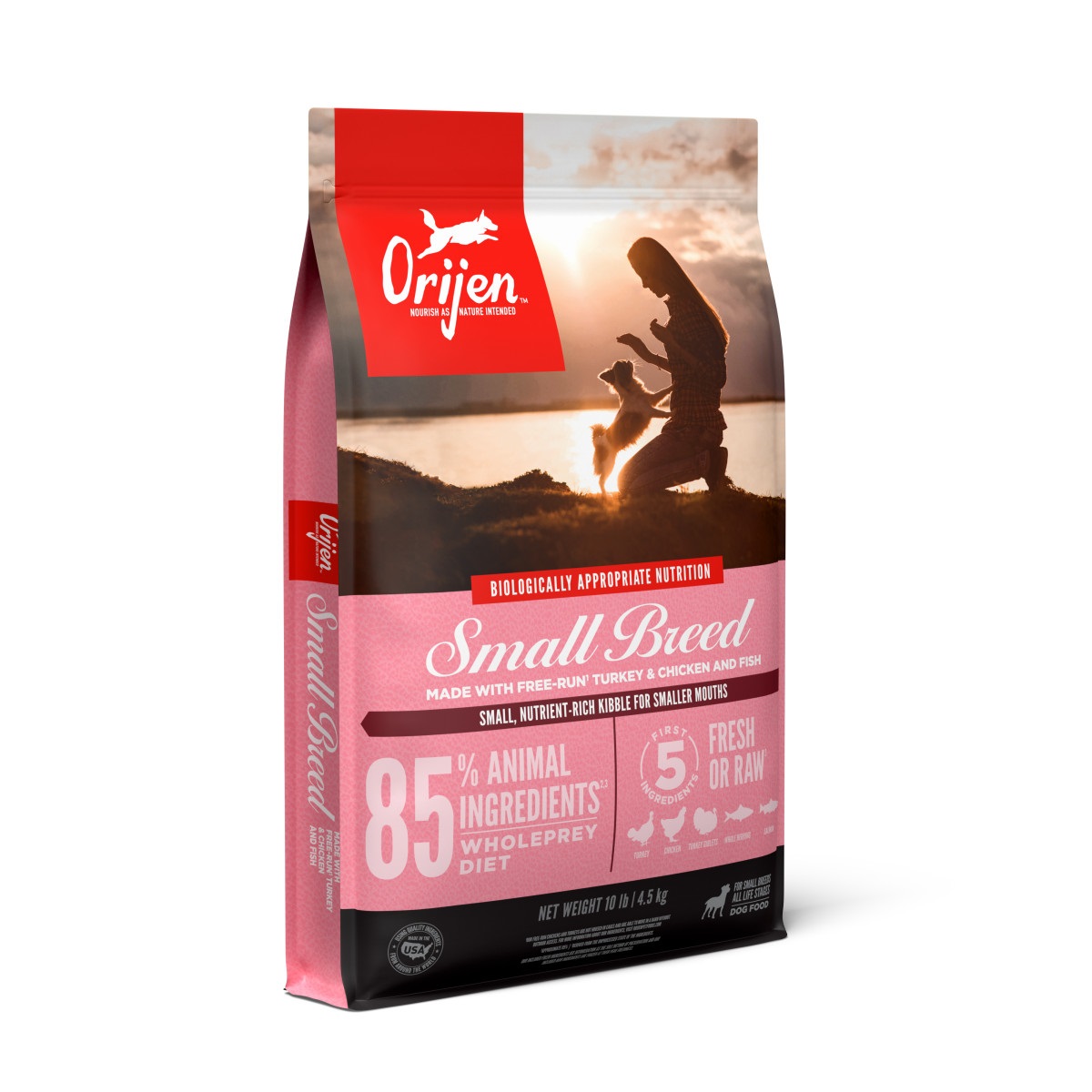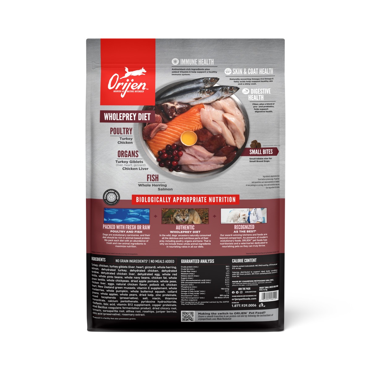 Give your small breed dog the big nutrition he needs to thrive with ORIJEN Small Breed Dry Dog Food. Packed with the protein and nutrients small dogs need in a special kibble shape that’s easy for them to eat, this biologically appropriate recipe is made with up to 85% animal ingredients. As an ancestral carnivore, your pint-sized pal needs a diet rich in protein, which is why this food starts with five fresh or raw poultry and fish ingredients, including turkey, chicken, turkey giblets, quail, whole blue whiting. With no added soy, corn, tapioca or wheat ingredients, this grain-free formula has everything your dog wants—and nothing you don’t. Complete with a delicious freeze-dried coating, this food is full of nutrition and raw flavor to drive your dog wild!