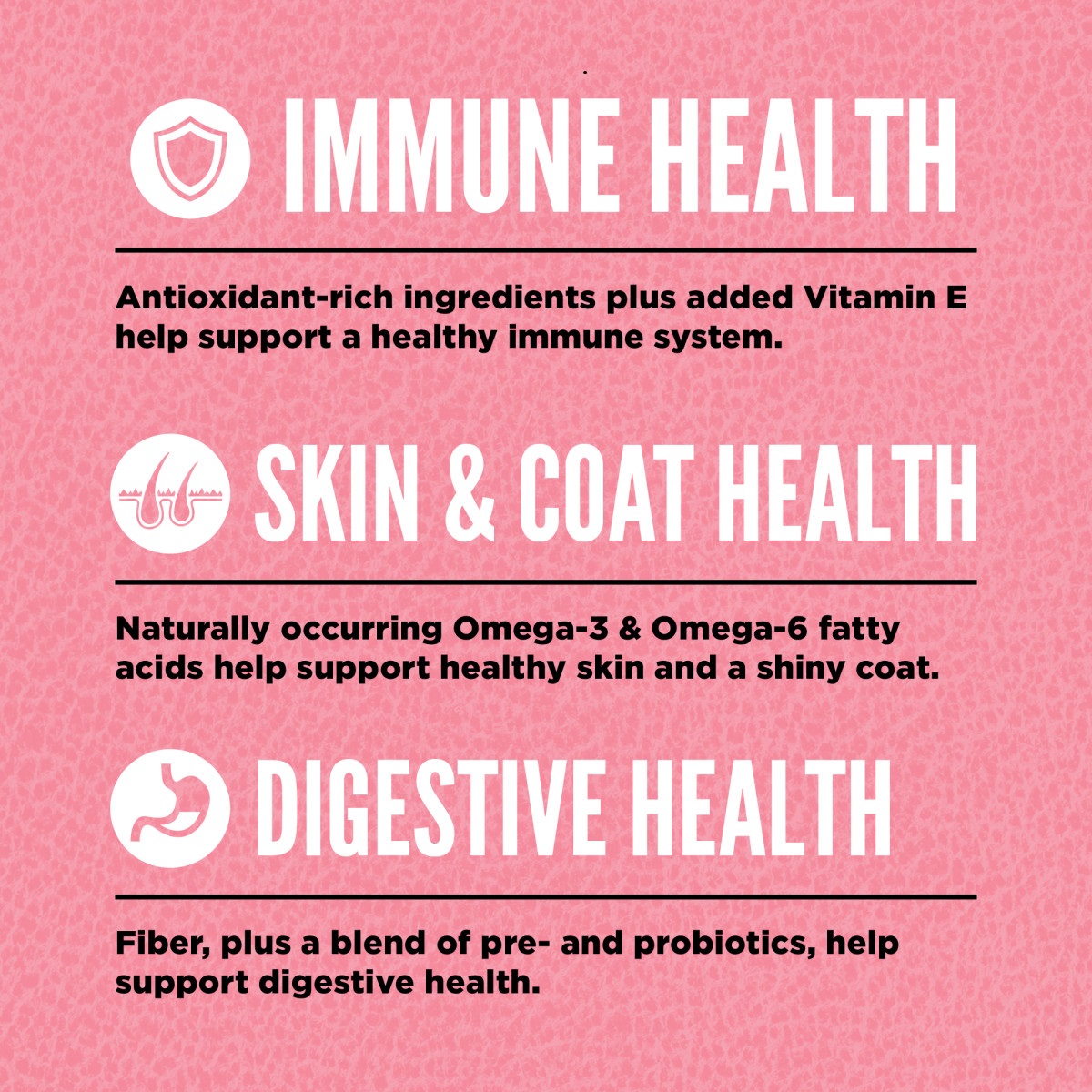 - Grain-free formula contains no added soy, corn, wheat or tapioca.