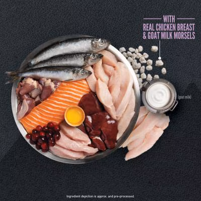 Chicken, Turkey, Salmon, Whole Herring, Chicken Giblets (Liver, Heart, Gizzard), Dehydrated Chicken, Dehydrated Turkey, Dehydrated Herring, Dehydrated Chicken Liver, Dehydrated Egg, Whole Red Lentils, Whole Pinto Beans, Turkey Giblets (Liver, Heart, Gizzard), Eggs, Pollock Oil, Chicken Fat, Whole Green Lentils, Whole Navy Beans, Whole Chickpeas, Whole Peas, Natural Chicken Flavor, Ground Miscanthus Grass, Freeze-Dried Chicken, Freeze-Dried Goat Milk, Choline Chloride, Whole Cranberries, Dried Kelp, Mixed Tocopherols (Preservative), Whole Pumpkin, Whole Butternut Squash, Collard Greens, Whole Apples, Whole Pears, Zinc Proteinate, Riboflavin, Folic Acid, Thiamine Mononitrate, Niacin, Pyridoxine Hydrochloride, Copper Proteinate, Dried Bacillus Coagulans Fermentation Product, Dried Chicory Root, Turmeric, Sarsaparilla Root, Althea Root, Rosehips, Juniper Berries, Citric Acid (Preservative), Rosemary Extract.