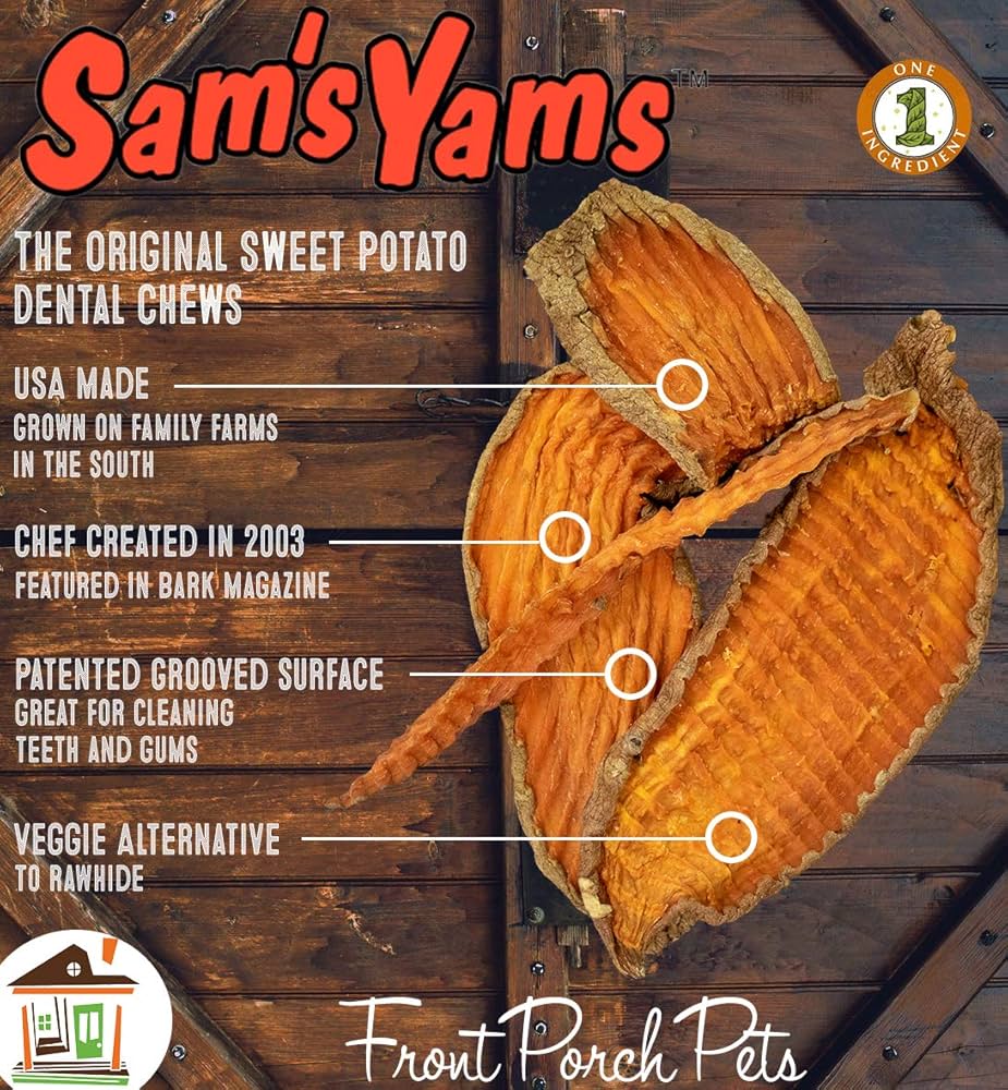 Treat your dog to something naturally better! Sam’s Yams® Veggie Rawhide Chews are made from 100% USA-grown sweet potatoes and slowly dried to chewy perfection by Chef David in Wisconsin. These wholesome chews are grain-free, gluten-free, vegan, and packed with nutrients—ideal for dogs of all sizes, especially those with dietary sensitivities. Each chew contains around 93 calories of tail-wagging goodness.