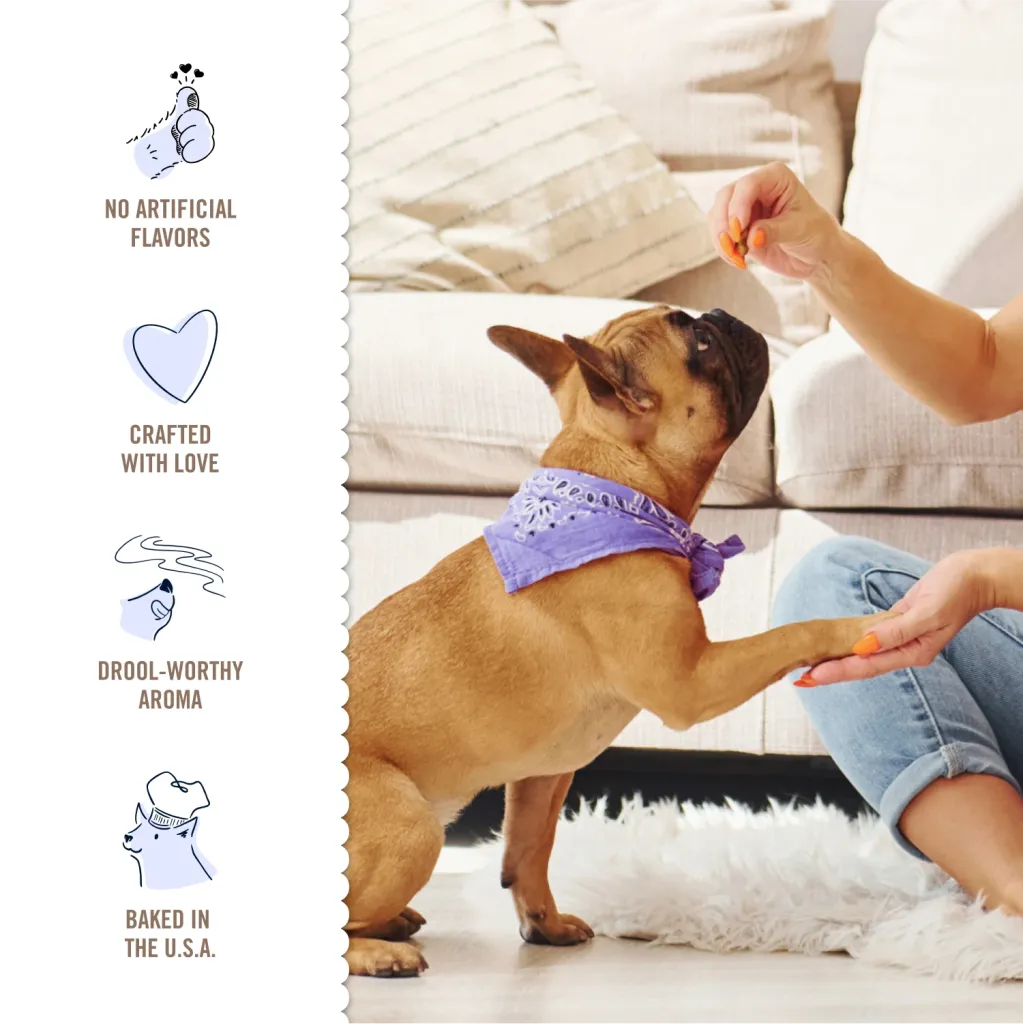 • Soft-baked dog treats have a drool-worthy pumpkin or peanut butter & banana flavor.