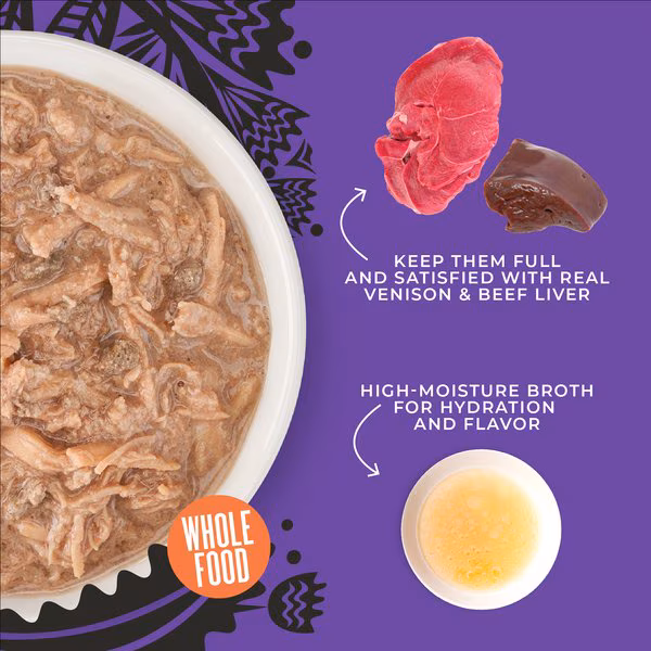 Venison Broth, Chicken, Venison, Beef Liver, Salt, Guar Gum, Potassium Chloride, Taurine, Choline Chloride, Magnesium Sulfate, Zinc Oxide, Tricalcium Phosphate, Iron Glycine Complex, Vitamin E Supplement, Niacin (Vitamin B3), Thiamine Mononitrate (Vitamin B1), Copper Sulfate, Sodium Selenite, Manganese Sulfate, Vitamin A Supplement, D-Calcium Pantothenate, Vitamin B12 Supplement, Riboflavin Supplement (Vitamin B2), Pyridoxine Hydrochloride (Vitamin B6), Biotin, Folic Acid, Potassium Iodide, Vitamin D3 Supplement.