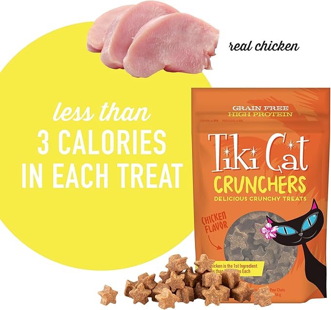 Because cats are carnivores, Tiki Cat Crunchers is packed with high-quality animal protein, starting with real chicken as the first ingredient. They also feature antioxidant nutrients from green tea, gentle fiber from pumpkin to support digestion, omega-3 fatty acids from salmon oil and flaxseed to support a healthy immune system, and omega-6 fatty acids from chicken fat to promote healthy skin and shiny coat. No grains, added gluten, by-products, artificial colors, flavors or preservatives.