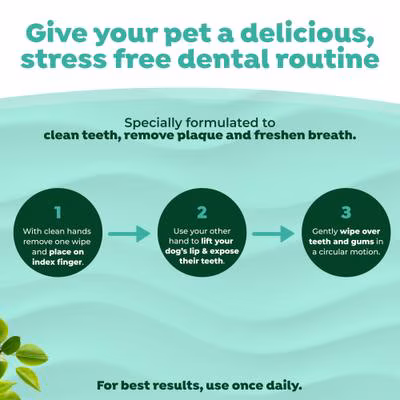 With clean hands, remove one wipe and place on your index finger. Use your other hand to lift your dog’s lip and expose their teeth. Gently wipe over the teeth and gums in a circular motion. Dispose after use. For best results, use once daily.