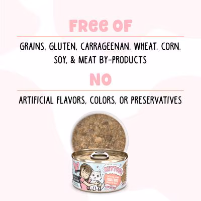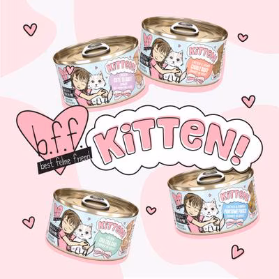 BFF Kitten Cuddle Buds Wet Cat Food is the perfect meal for your growing furbaby! This recipe features cage-free chicken, tuna, and salmon in a delicious gravy. This complete and balanced meal is formulated to support your furry friend’s physical and mental health and is free from grain, gluten, and carrageenan. High-quality proteins, excellent nutrition, and high moisture content support your growing kitty’s nutritional needs. Plus, there are no artificial colors, preservatives, corn, wheat, or soy. Weruva is a family company, owned and operated by pet parents.