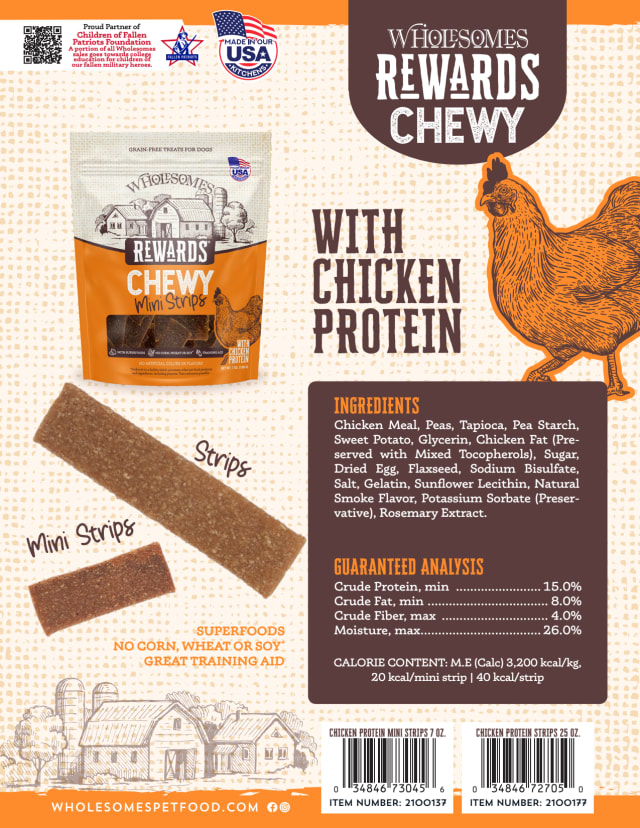 Our Wholesomes Rewards Chewy Strips with Chicken Protein are crafted with the farmland’s finest ingredients dogs can’t resist! These soft treats make training fun and rewarding. Packed with superfoods like sweet potato and flaxseed from trusted sources, our healthy treats deliver nutrition in every bite. No corn, wheat, grains, or gluten – just tasty training treats your pup will love.