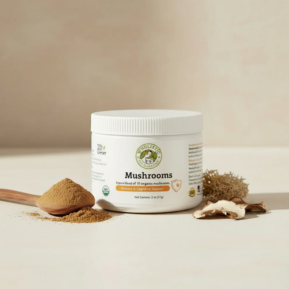 Support your pet’s wellness from the inside out with Wholistic Pet Organics 10-Mushroom Blend. This powerful supplement features ten functional mushrooms — including Reishi, Shiitake, Maitake, and Lion’s Mane — to help promote immune health, vitality, and natural resilience. Made for both dogs and cats, this fine powder mixes easily into meals, delivering clean, holistic support without fillers, chemicals, or artificial additives. Simple, natural, and packed with benefits.