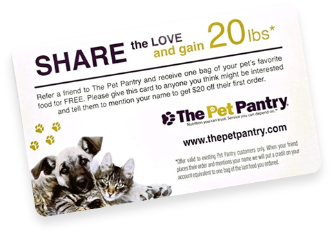 Give your friends $20 off The Pet Pantry Brand Natural Foods. When your friends buy from your invite link, you get a FREE 20lb Bag of Food!