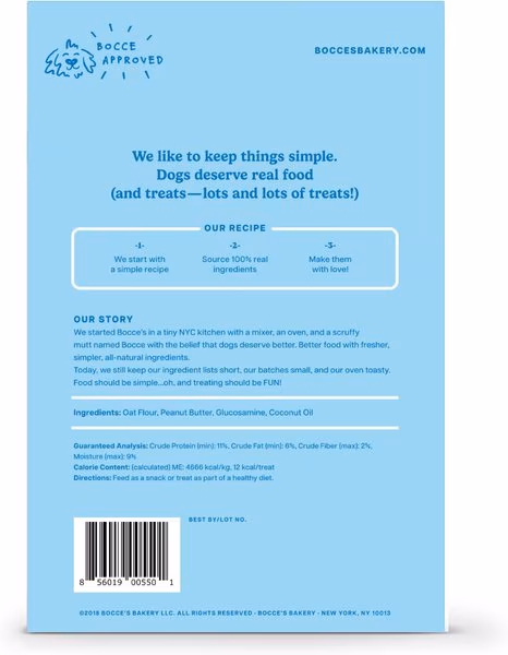 Help support your canine companionâs joint health with Bocceâs Bakery Daily Support Hip Aid Peanut Butter Recipe Dog Treats. These crunchy, limited-ingredient goodies are oven-baked in the USA with real ingredients that are completely recognizable. They are 100% free of wheat and are only crafted with oat flour, peanut butter and glucosamine to support your dogâs hip and jointsâthatâs it! Now you and your paw-tner can focus on the simple goodness of these rewards without worrying about nonsense fillers or by-product meals!