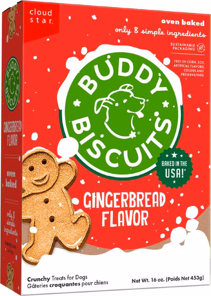 Treat your furry friend to some holiday cheer with Buddy Biscuits Holiday Gingerbread Crunchy Dog Treats. These oven-baked treats are made with yummy gingerbread flavor and come in cute gingerkid shapes. With just a few simple ingredients, these biscuits are a paw-fect holiday treat for pups of all sizes and ages. Plus, they are made with only eight ingredients, and they don’t have any corn, soy, artificial flavors, or colors. Made in the USA with high-quality ingredients, Buddy Biscuits are sure to make your four-legged family member’s tail wag with joy.