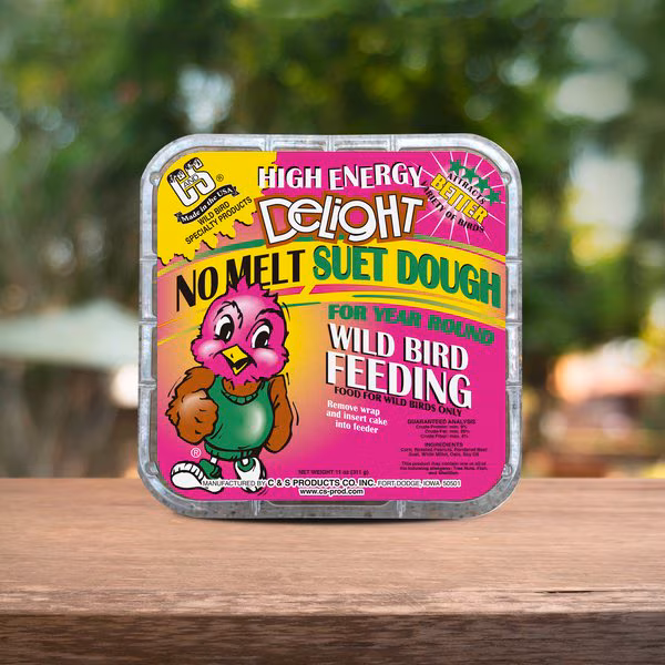 Feed your backyard birds without the mess! C&S High Energy Delight No Melt Suet Dough is crafted with premium ingredients like rendered beef fat and roasted peanuts to deliver healthy energy while minimizing waste. The no-melt formula holds up in temperatures up to 100°F, making them perfect for year-round feeding. Since 1986, C&S Products has crafted a variety of bird feeding products and accessories that deliver great value and results. Welcome new feathered friends to your yard and keep them coming back season after season with C&S No-Melt Suet Dough.